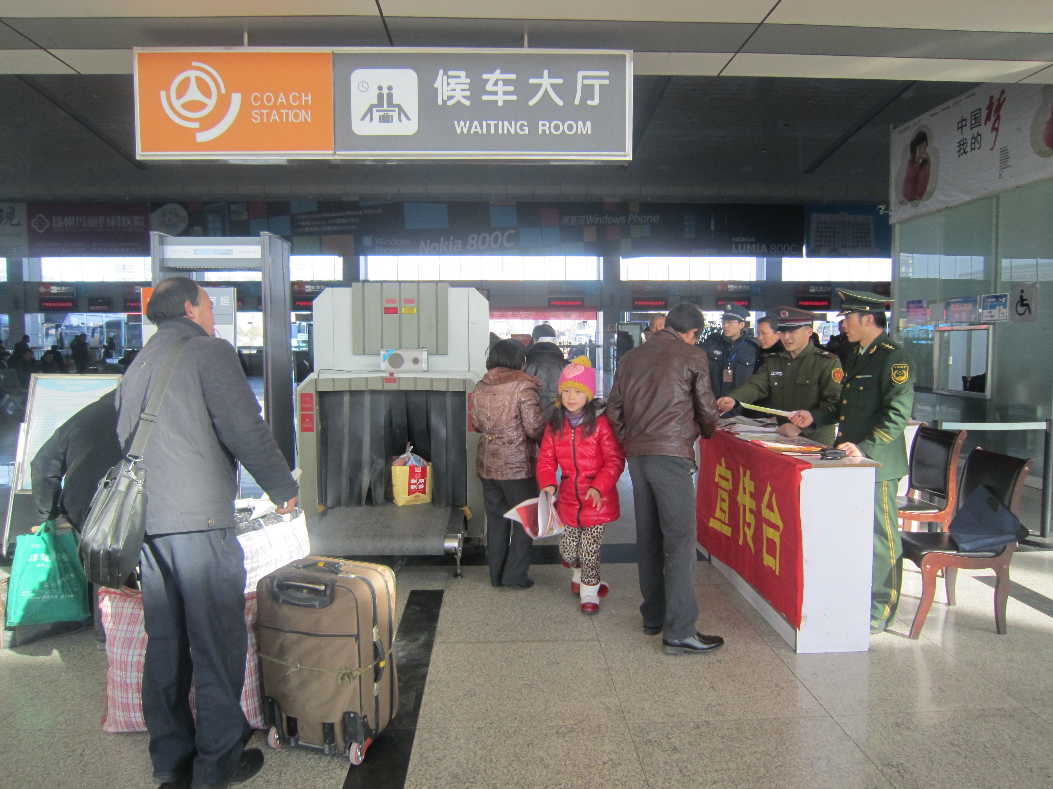 危險(xiǎn)品檢查儀旁,紅色的安全宣傳臺引人注目,武警揚(yáng)州消防支隊(duì)的幾名官兵和車站員工一起向接受危險(xiǎn)品檢查的旅客熱情發(fā)放宣傳畫,并提醒在返鄉(xiāng)旅程中應(yīng)該注意的安全事項(xiàng)。幾名女官兵還走進(jìn)候車廳發(fā)放,講解遇有緊急情況時(shí)的急救逃生知識。不少旅客在候車過程中,認(rèn)真看著宣傳畫,還不時(shí)交流,一旁的官兵不時(shí)接受旅客的咨詢,解答他們的問詢。