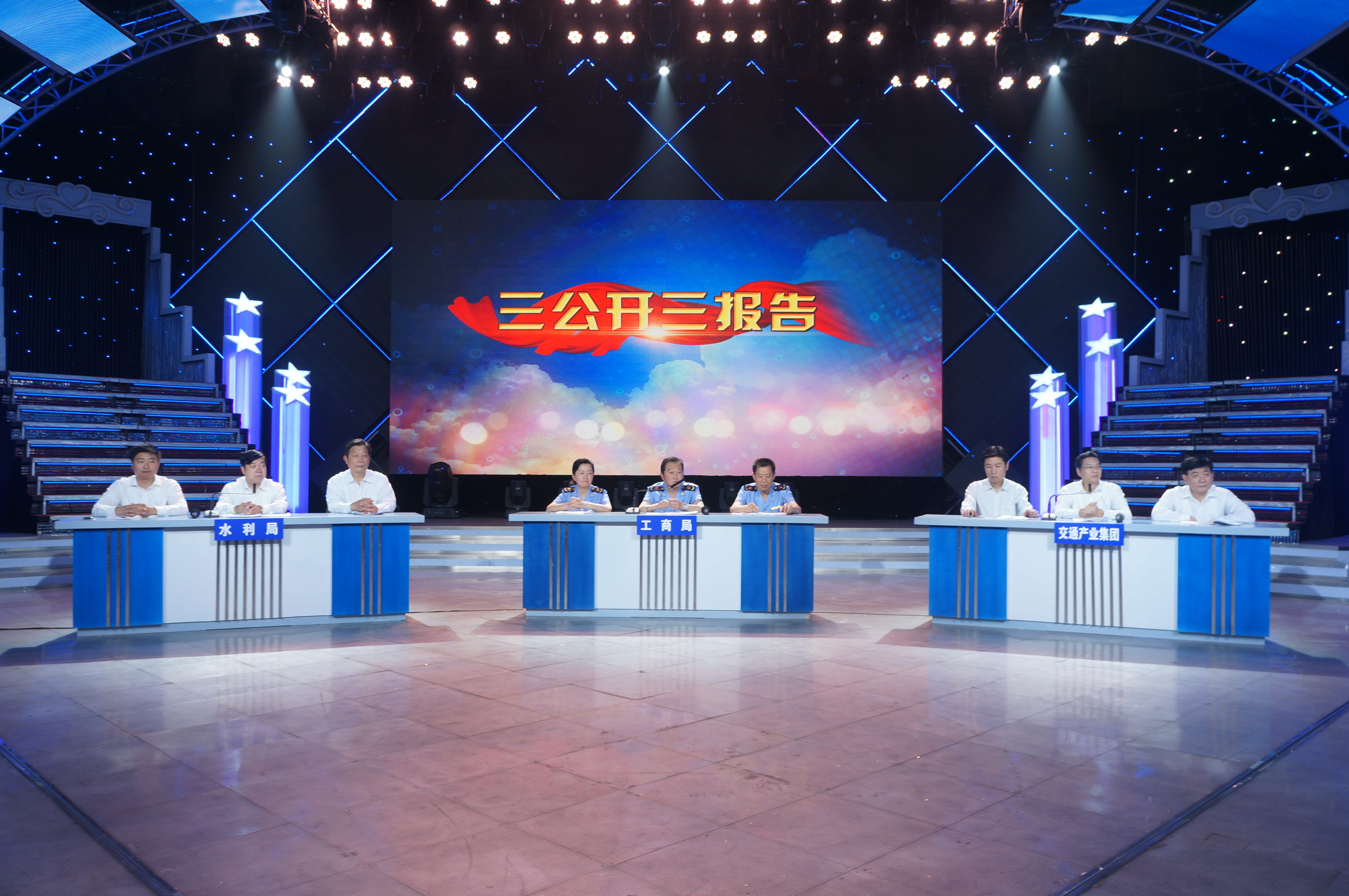 6月29日上午,市交通產業(yè)集團董事長、黨委書記、總經理周正權,集團公司總經理、黨委書記吳忠俊和市公交集團領導和走進廣電中心電視直播現場,與市水利局、工商局共同接受“三公開、三報告”考評打分。