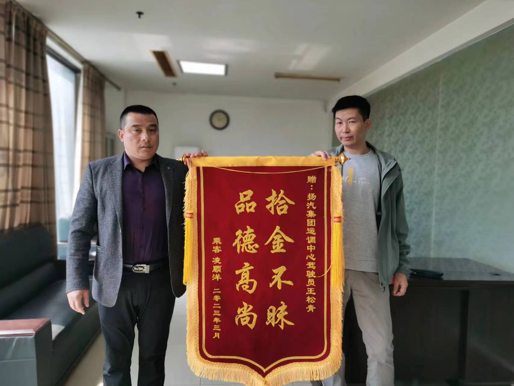 3月31日上午,市民凌先生來到江都汽車站,將一面印有“拾金不昧,品德高尚”的錦旗交到了分公司相關(guān)負責(zé)人的手上,以此來表達對駕駛員王松青師傅拾金不昧行為的感謝。