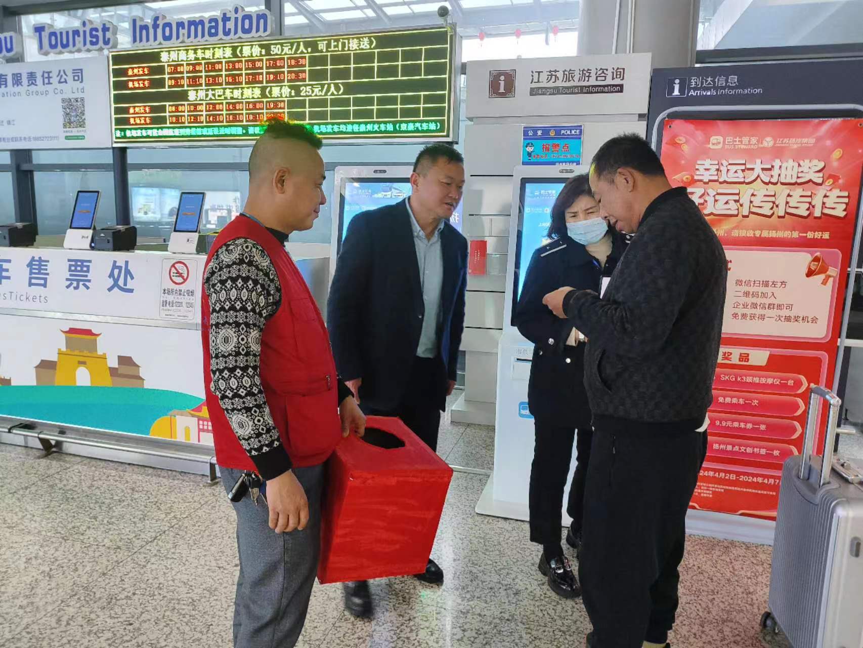 在抽獎活動現(xiàn)場,相關負責人與旅客進行了交流互動,介紹了活動的主題和參與方式,講解了機場專線的運營模式和專線?空军c和走向,熱情地向旅客介紹了揚州的旅游景點,同時,認真聽取了現(xiàn)場廣大旅客對機場專線建議。