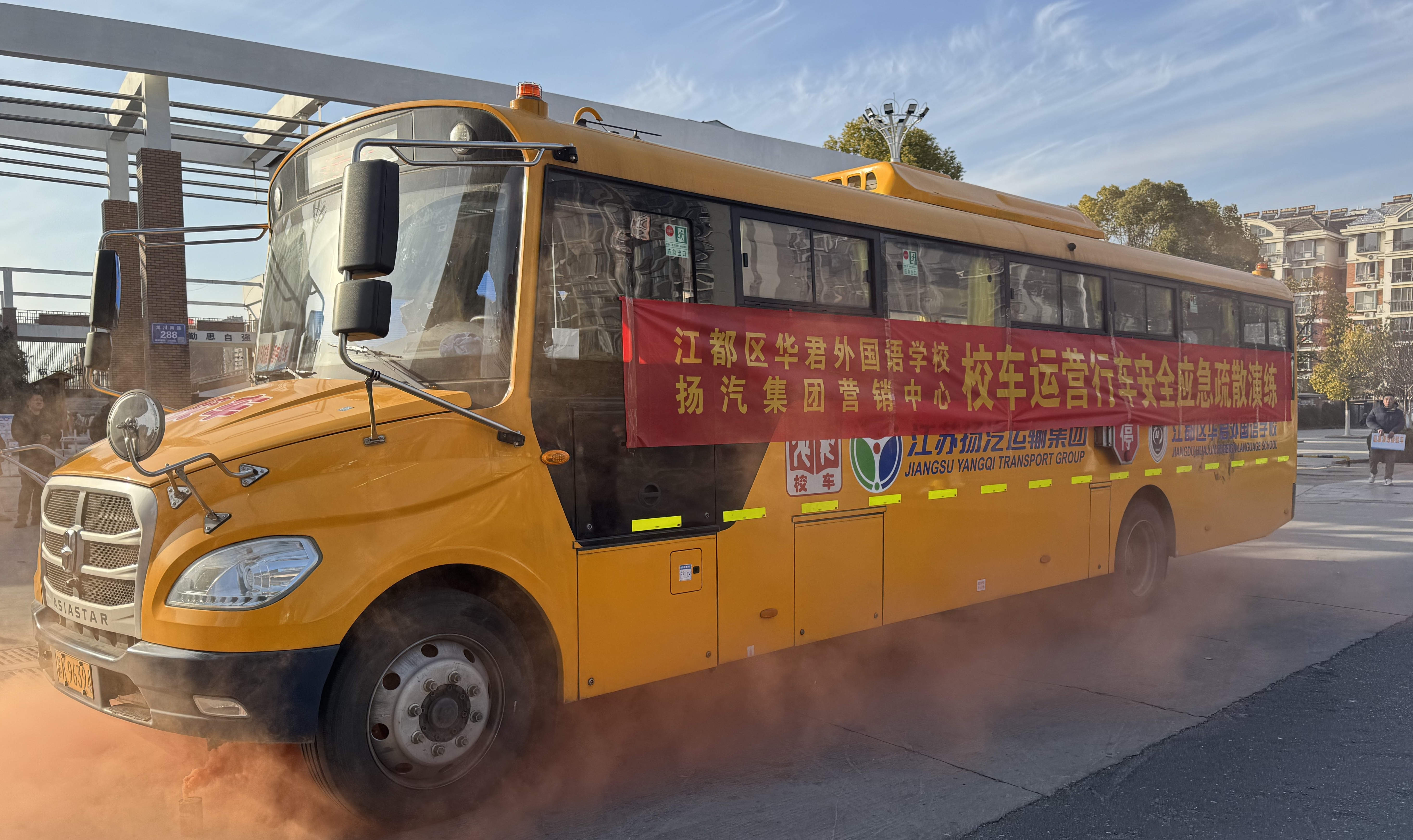 為進一步加強校車安全管理,提高師生在校車行駛中的安全應(yīng)急疏散能力,近日,揚汽集團與江都區(qū)華君外國語學校聯(lián)合開展了校車運營行車安全應(yīng)急疏散演練。揚汽集團副總經(jīng)理劉旭亮,江都區(qū)華君外國語學校副校長張?zhí)毂螅鲉挝坏陌踩芾砣藛T及師生共40余人參加本次活動。